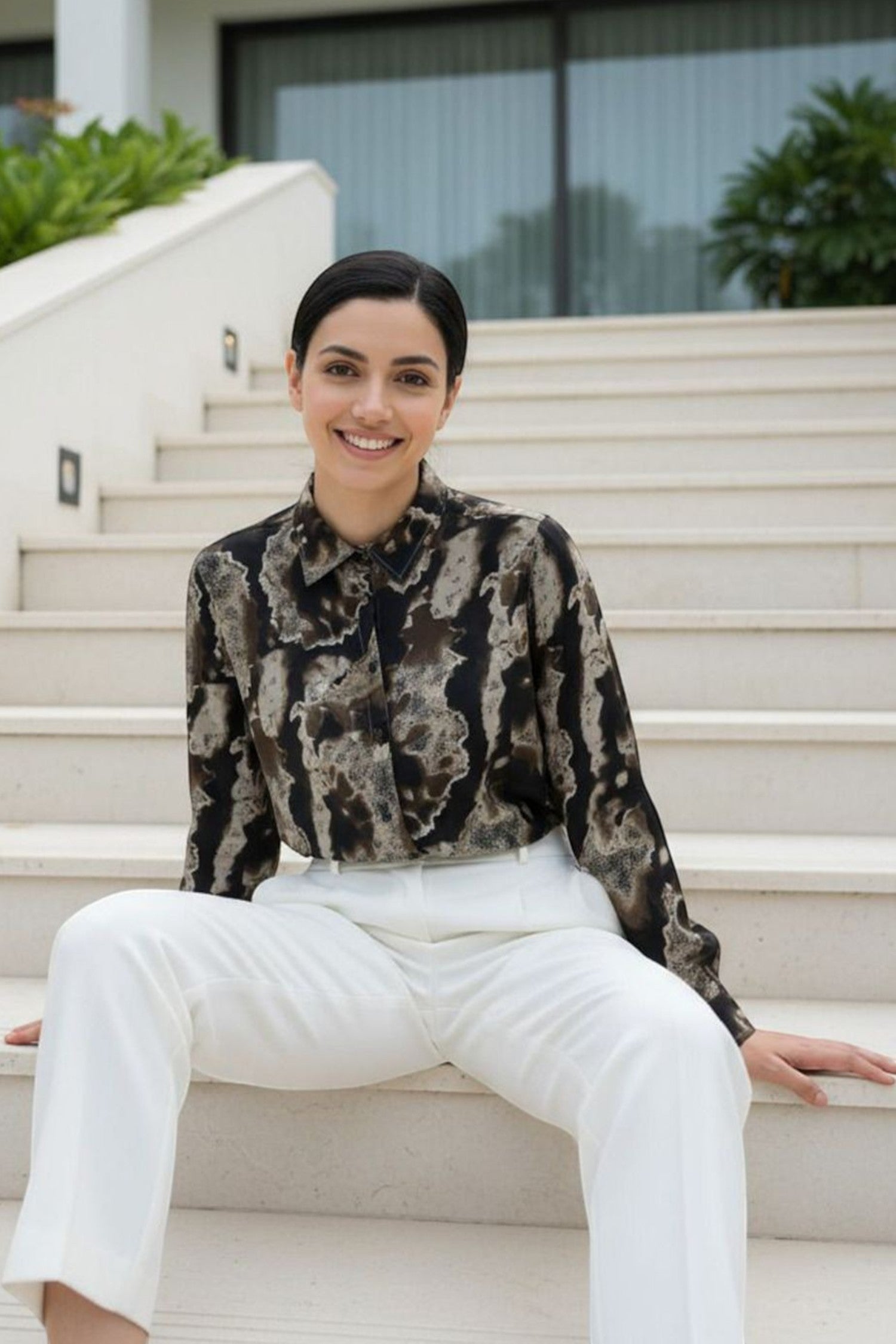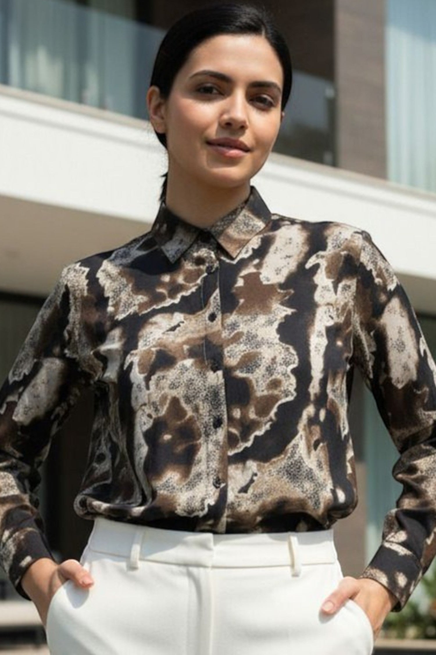 A refined blend of artistry and sophistication, this shirt features an abstract earth-tone print in rich shades of brown, beige, and black. Crafted from a fluid, lightweight fabric, it offers a relaxed yet structured silhouette. The classic collar and button-down front lend timeless appeal, while the unique print adds a contemporary edge. Perfect for both workwear and casual outings—pair it with tailored trousers or sleek denims for a polished finish.
