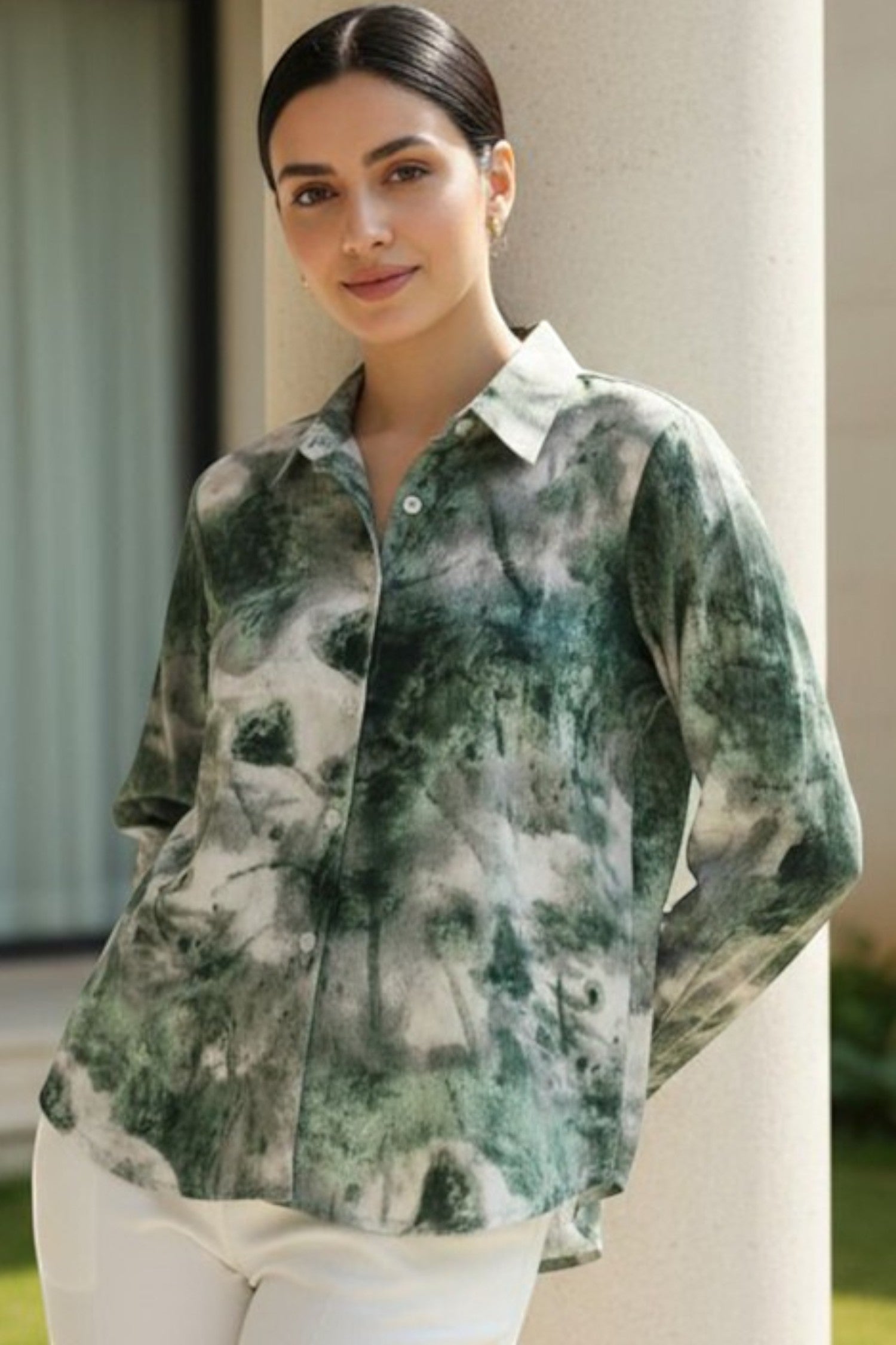 Add a touch of modern sophistication to your wardrobe with this emerald green abstract print shirt. Crafted from a smooth, lightweight fabric, it features a relaxed silhouette with a classic collar and full button-down front. The soft watercolor-inspired pattern in shades of green and white brings an effortless elegance to any look. Perfect for pairing with tailored trousers or denims for a polished yet contemporary style.