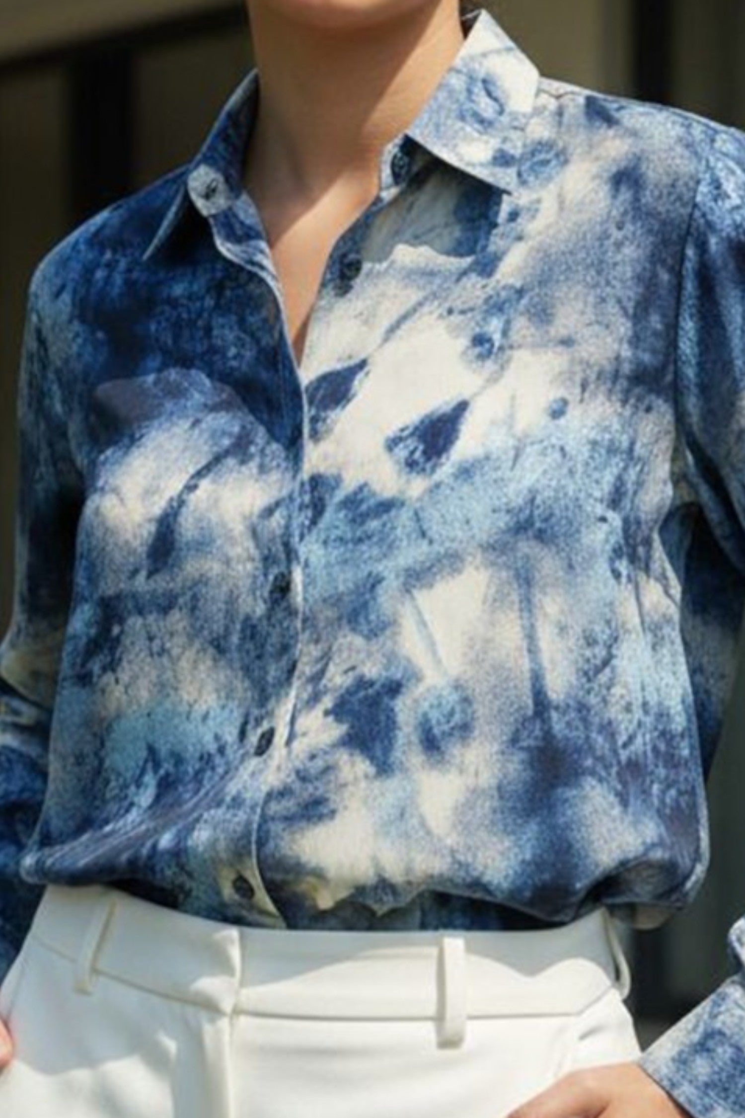 Effortlessly modern with an artistic edge, this shirt features a cloud-wash effect in deep indigo and soft ivory tones. Crafted from a smooth, lightweight fabric that drapes beautifully, it brings a relaxed yet polished vibe to any look. Designed with a classic collar, button-down front, and full sleeves, it transitions seamlessly from workdays to weekend outings. Style it tucked into tailored trousers or paired with denim for an elevated casual ensemble.