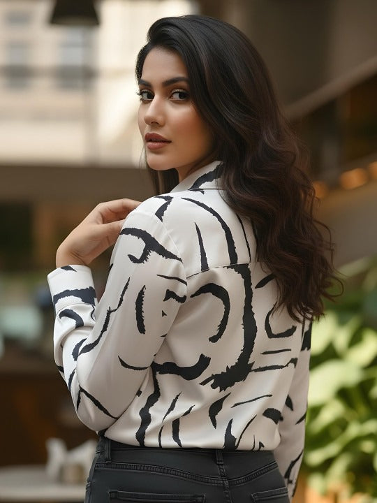 A sleek, satin-finish shirt featuring bold black brushstroke motifs on a crisp ivory base. Its modern abstract design, classic collar, and refined button placket make it the perfect statement piece for both work and weekend styling.