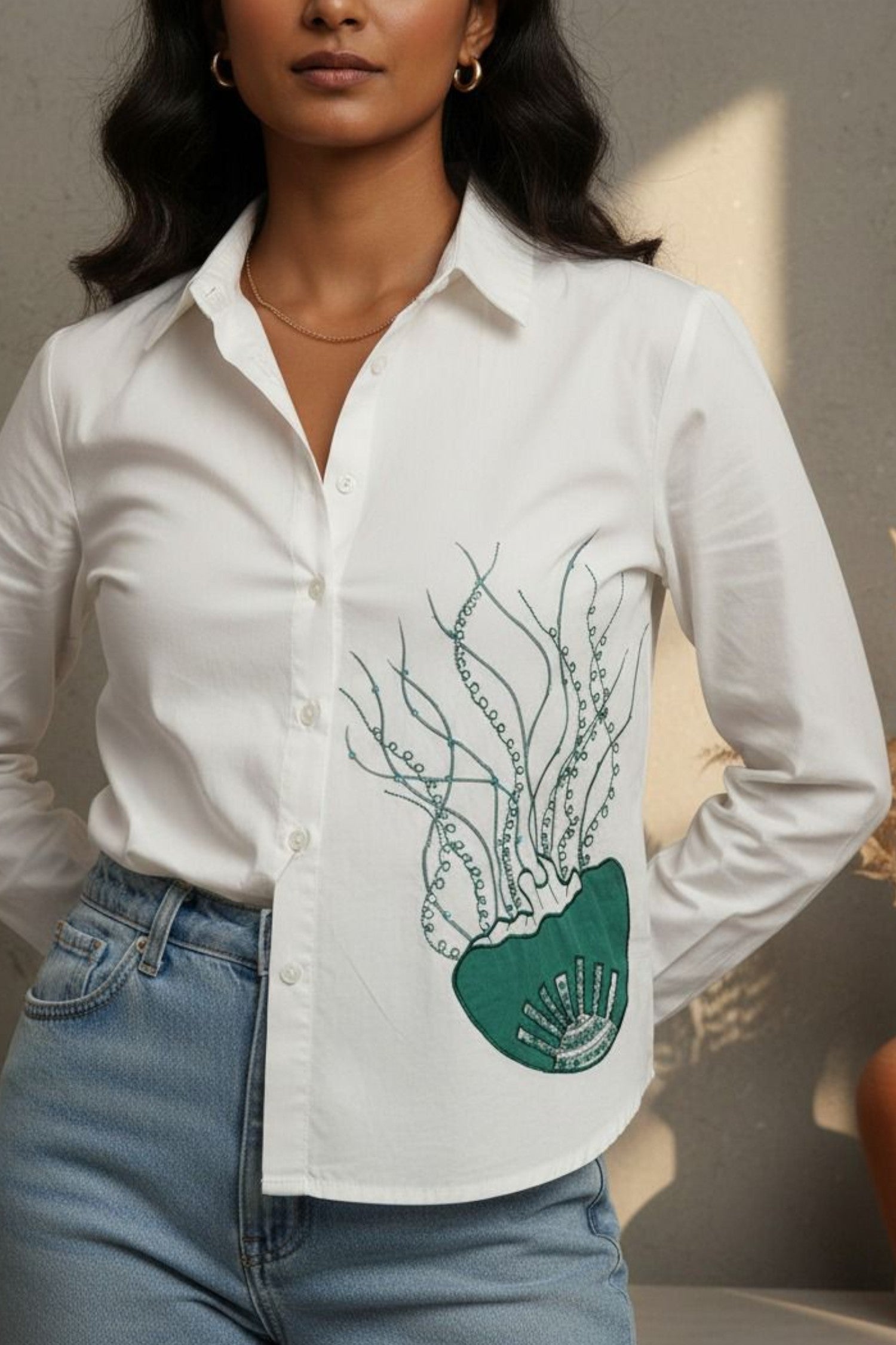 A crisp white cotton shirt featuring a stunning hand-embroidered green botanical motif inspired by sea flora. The intricate threadwork adds an artistic touch to its minimalist silhouette, making it a perfect blend of elegance and modern craftsmanship — ideal for both casual and semi-formal looks.